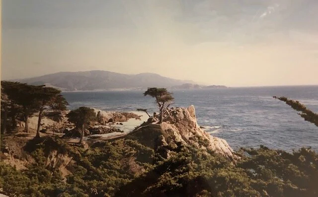 In March, 1988, I was lucky enough to take these two pictures which hang in our house on opposite walls. The “busy” one shows a scene from the Old Fisherman’s Wharf (now probably re-branded). The other one shows the recognizable Lone Cypress on 17 Mile Drive near the famous Pebble Beach Golf Links.